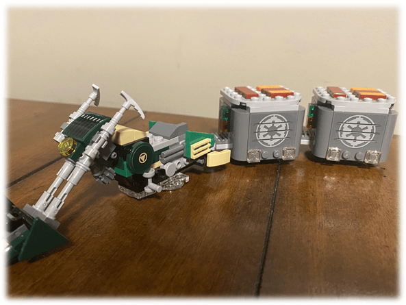 The proportions of this set are OUT TO LUNCH. The figure doesn’t even almost fit the bike, and putting all that detail into pedals that the figure couldn’t even dream of reaching definitely detracts. I described it as “A Baby Sitting on Dad’s Chopper”: cannot reach the controls, cannot reach the pedals, he’d be better off hopping in one of the crates. Unfortunately, this is a disconnect often seen in Star Wars sets, where the build might be accurate, but the scale is off, and vice versa. In this case I would’ve liked to have seen them scale down the build even a little, while keeping the shaping of the bike.