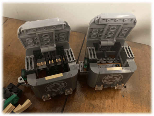 The overall build for Kanan’s bike is really cool and partly the reason I wanted the set so badly. It uses some great techniques to build up the front steering vanes and outrigging section, and the bike adds some nice detailing towards the pedals and rear. Arguably the inclusion of two imperial crates is even more appealing, and these are built up really nicely and look perfect for any imperial base or diorama. They can be linked or unliked via ball-joints, and even include some generous cargo, as seen below, in the form of extra blasters and thermal detonators.