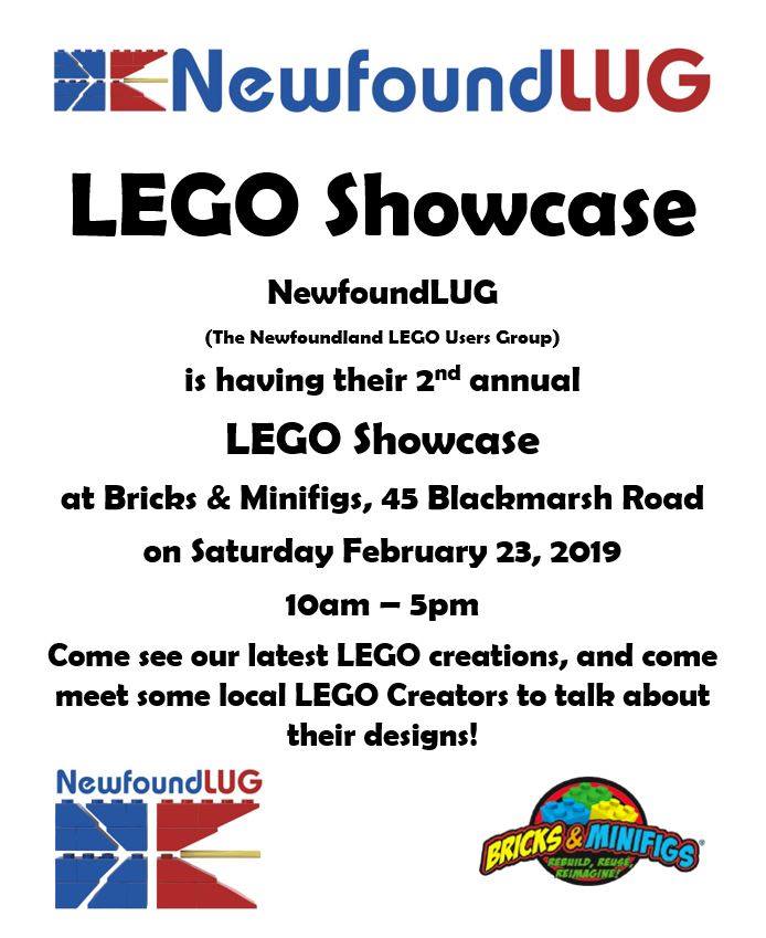 NewfoundLUG Presents our 2nd Annual LEGO Showcase taking place on Feb. 23, 2019. Hosted by Bricks & Minifigs, 45 Blackmarsh Road in St. John’s. Displaying our own LEGO creations and LEGO sets in many themes, City, Castle, Star Wars, Trains and many more. NewfoundLUG Members will be available to talk about their creations and all things LEGO. Free to enter!!