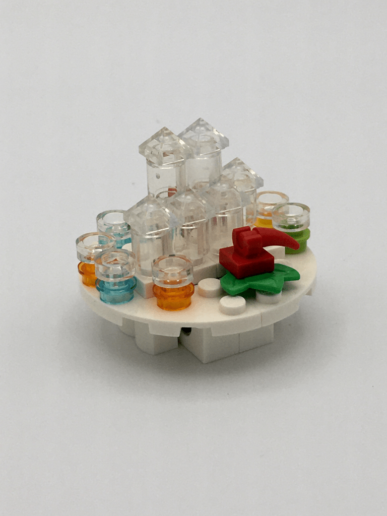 Matt: I’d be lying if I said I wasn’t at least a bit surprised that HP has the lead. I think with a string of mediocre builds in the mid-calendar, they are lucky to be here at this point. But I’ll take it. Behind door #18 is half a yule ball ice sculpture table with food and potentially drink. Whew. That was a mouthful. This build is presumably based off the movie scene as I don’t recall this item being a main fixture in the novel. The build is essentially half complete as the 1×4 technic brick with holes suggests that the other half of the table is yet to come. There appear to be food and drink of some sort adorning the table, but I’d be hesitant to outright label the exact type (if anyone knows, feel free to chime in). The main highlight for me are the 1×1 trans clear pyramid bricks, which are rare in my opinion. I also like how the “bubble” forms in each brick near the top. Usually, this pattern is random in trans clear pieces, but is rather consistent in this mold- at least, on the pieces I received. All in all, it’s a build that may contribute to the Yule Ball festivities, but again, loses marks for not screaming Harry Potter or being “inherently magical” (thanks Patrick). In conclusion, I don’t feel this is the strongest entry this deep into the calendar but there have been worse builds to date.